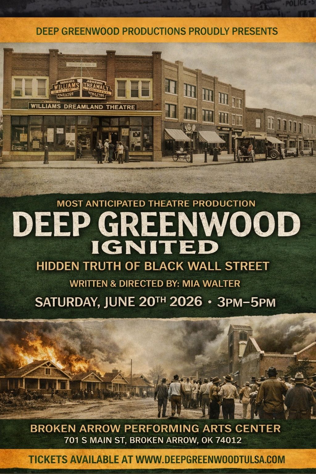 Deep Greenwood Ignited: The Hidden Truth of Black Wall Street is a powerful theatrical production that reveals the full, unvarnished story of the rise, destruction, and resilience of Tulsa’s Historic Greenwood District — known to history as Black Wall Street.